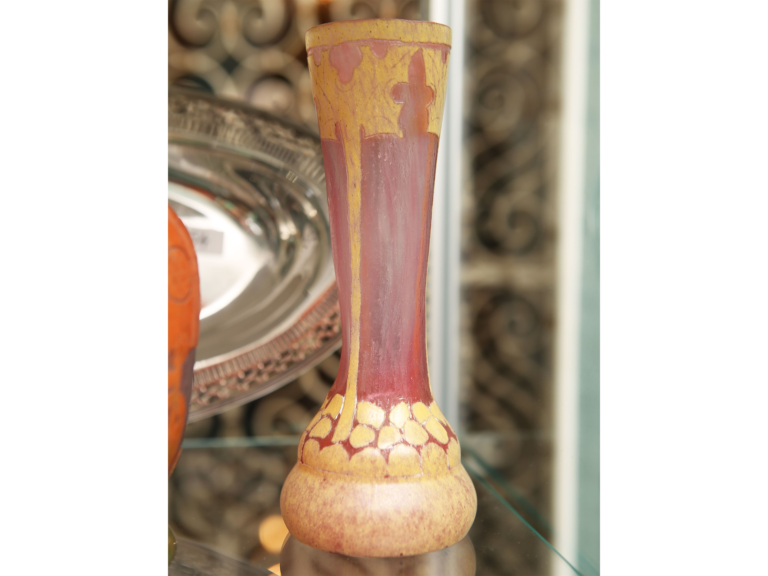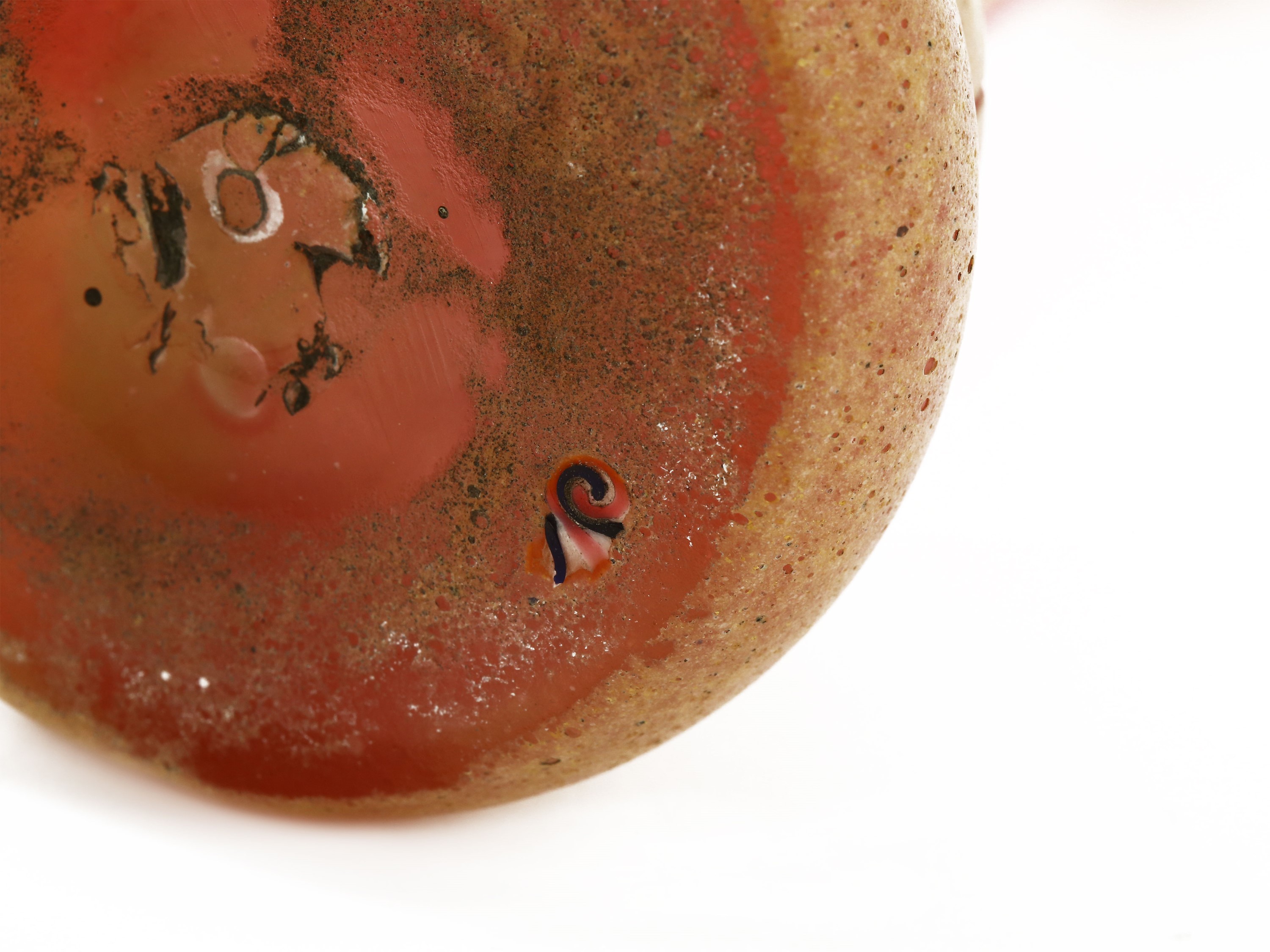 Francia, 1918-1921 decoro di foglie stilizzate a cammeo in polvere gialla su fondo rosa. Firma alla base con berlingot consistente in una murrina con i colori del tricolore francese.