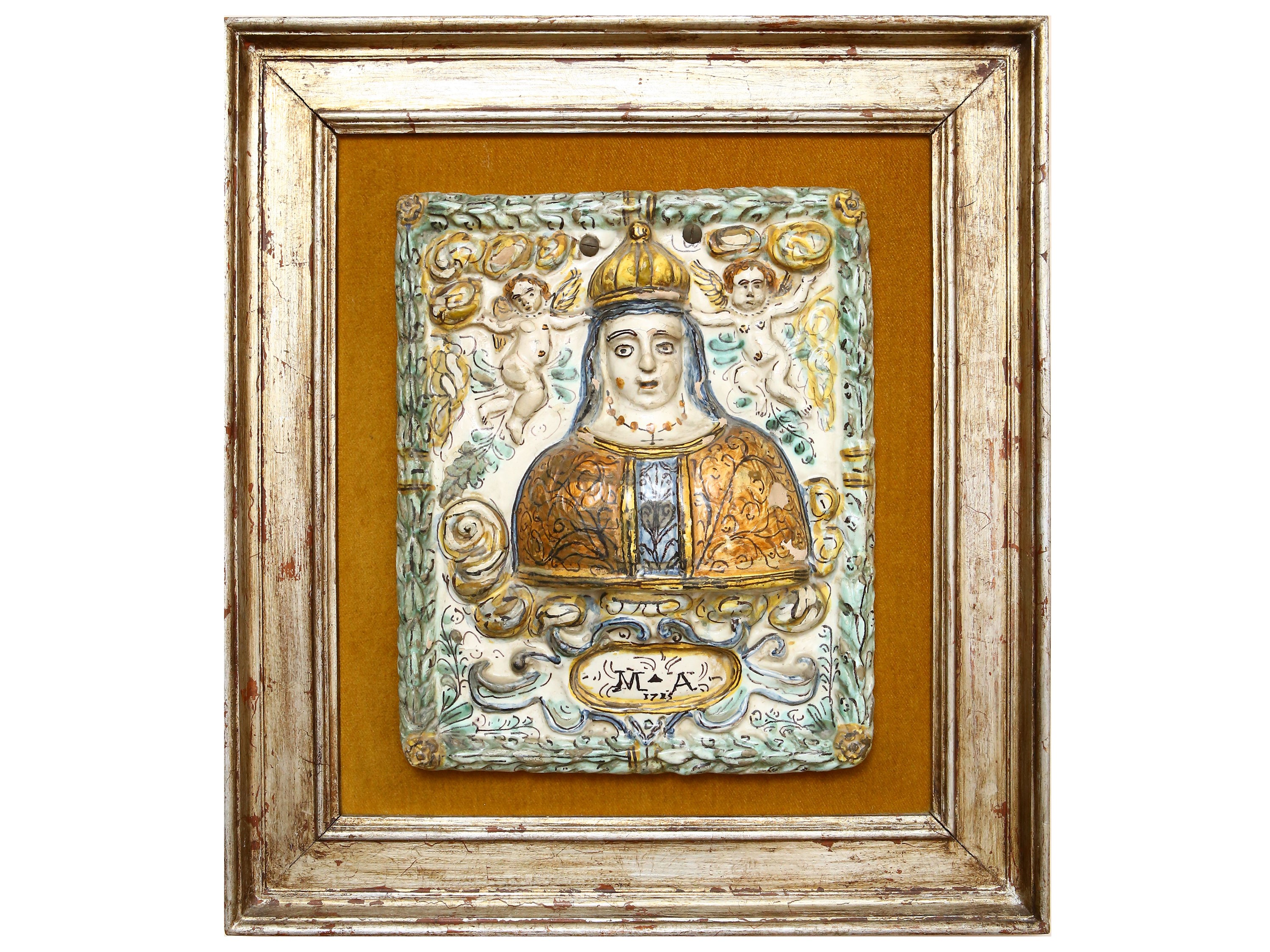 cm 32x27, complessivamente cm 53x48 Italia centrale, seconda metà del XVIII secolo raffigurante ad altorilievo l'Incoronazione della Vergine dipinta nei toni del verde, giallo e blu, applicata a pannello rivestito in tessuto color ocra, in cornice, alcuni difetti allo smalto