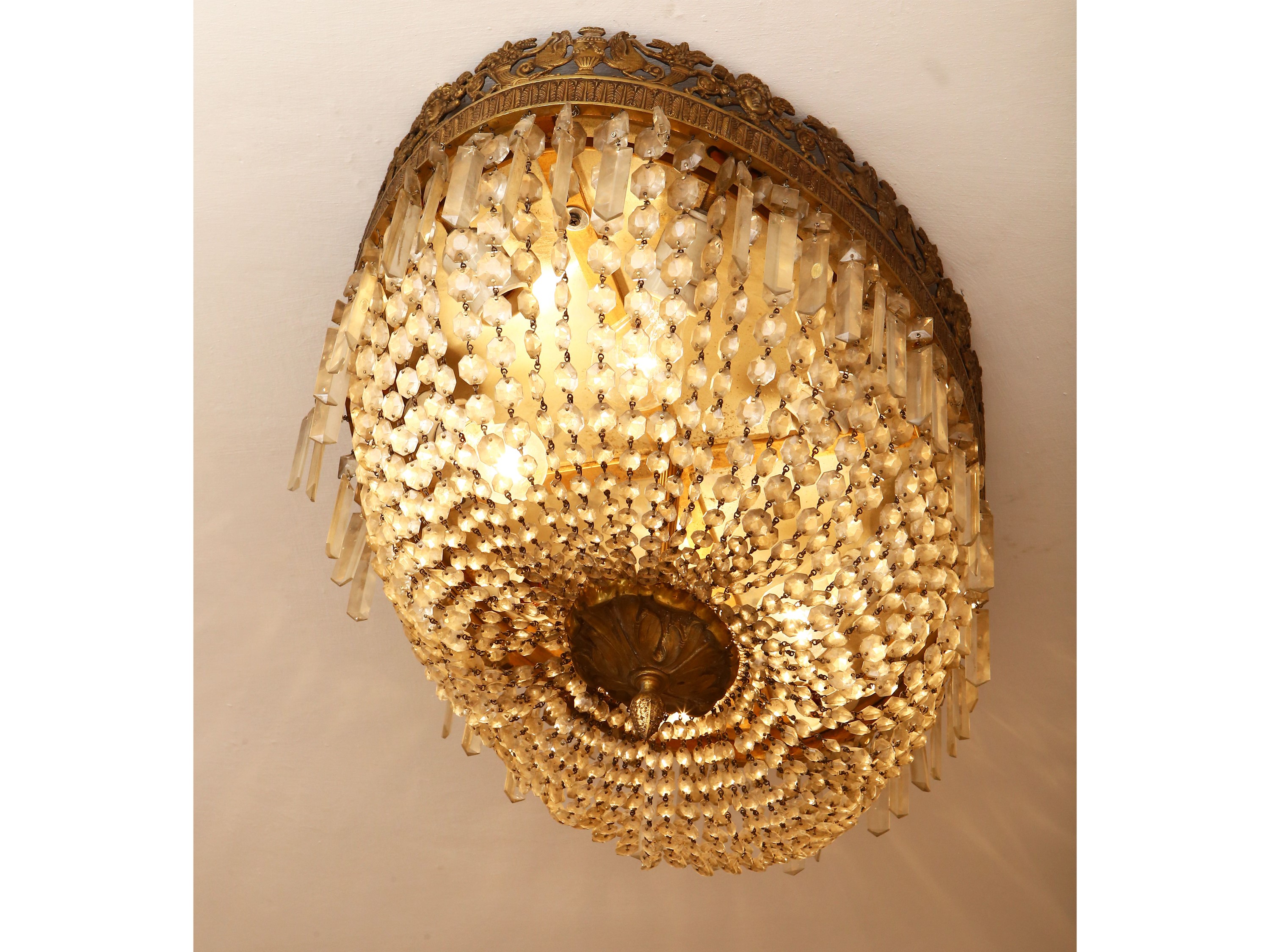 Plafoniera a paniere in bronzo dorato e vetro