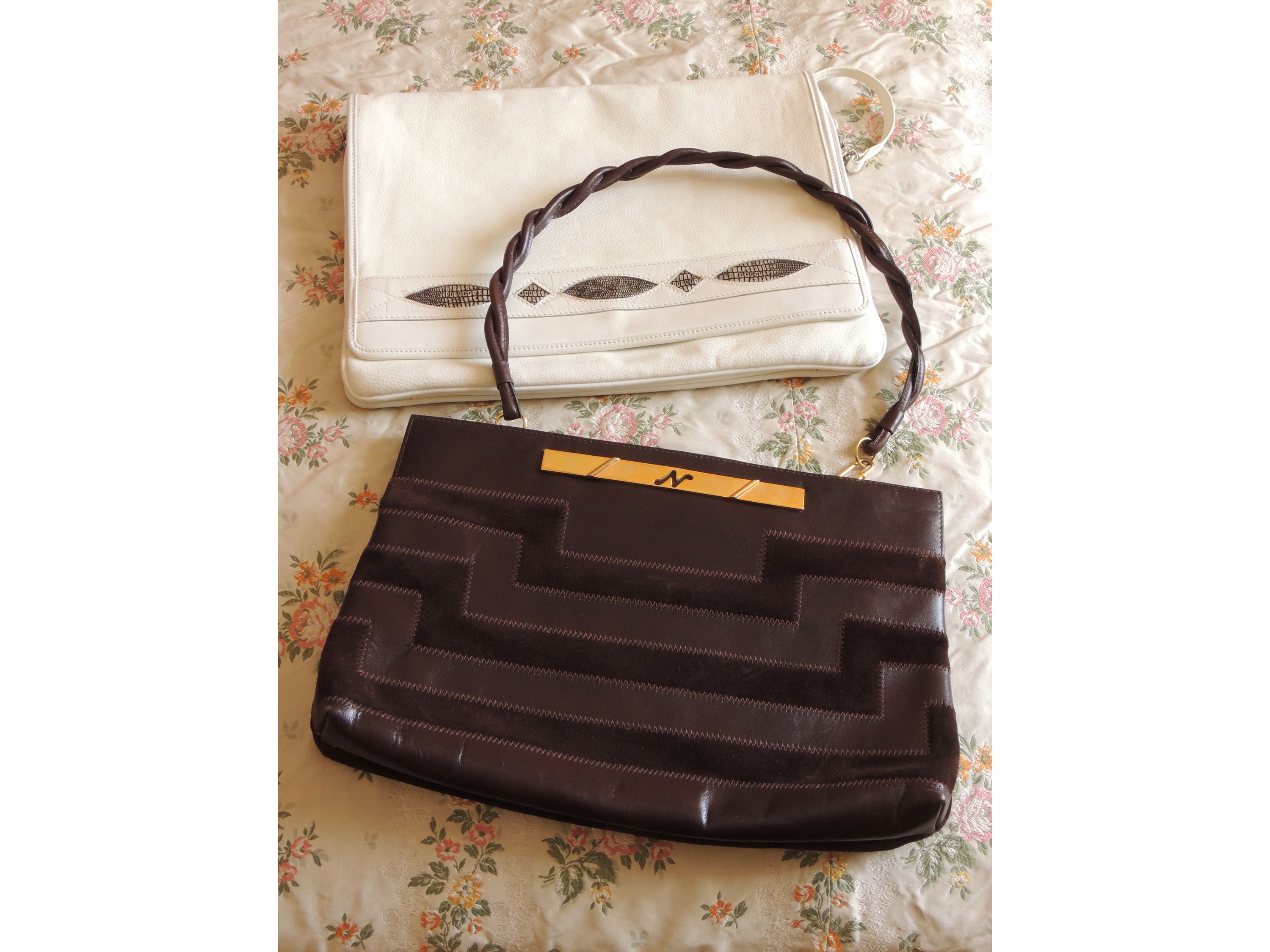 borsa bianca cm 34x26, marrone cm 35x22 e cm 26x15x7 Anni Settanta e Anni Ottanta due borse a tracolla, una bianca ed una marrone, un'altra in pelle e camoscio marrone con manico intrecciato in pelle ed una pochette in pelle stampata a simulare il coccodrillo, lievi difetti
