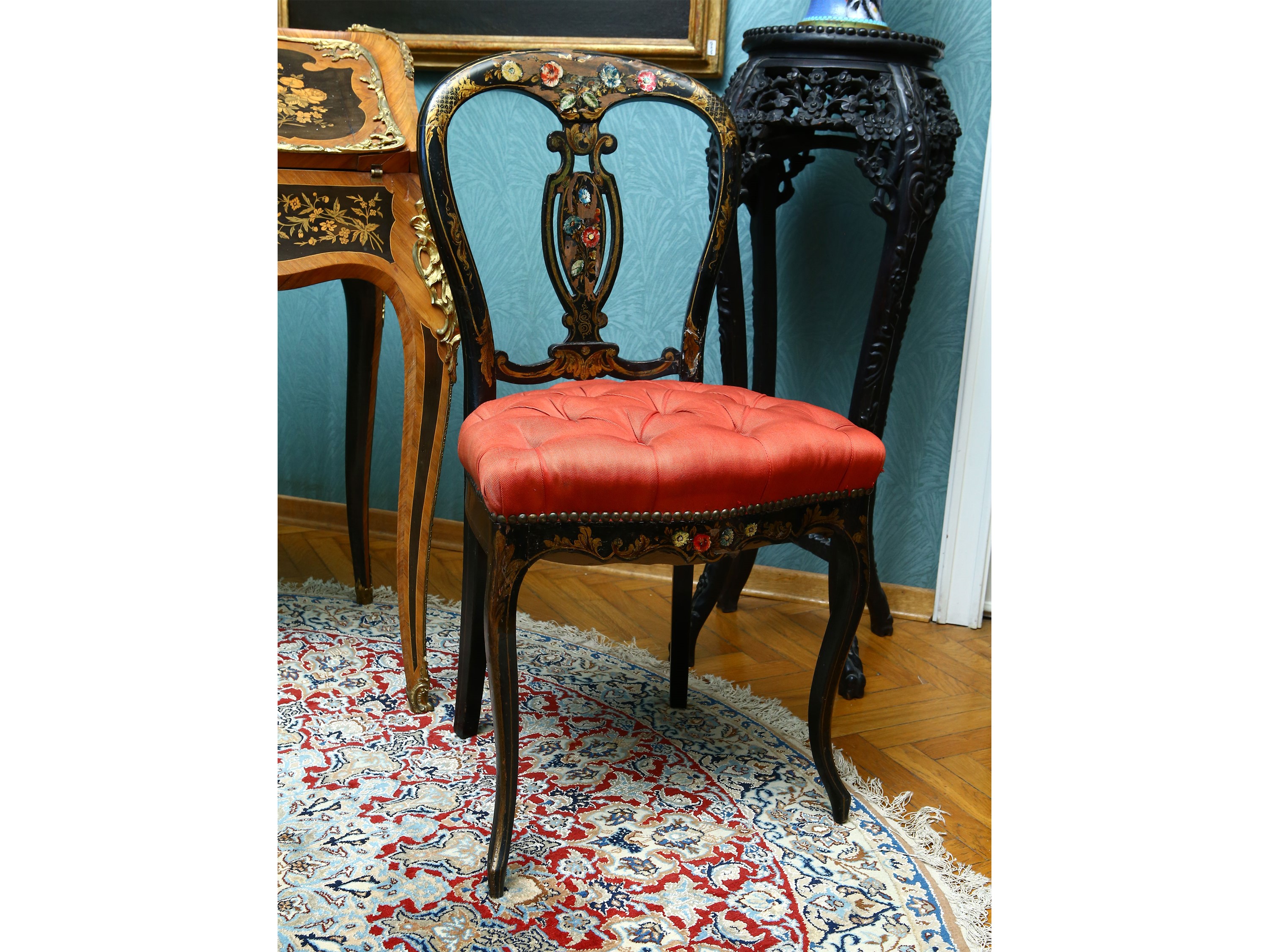 Liguria, seconda metà del XIX secolo interamente dipinte a motivi floreali lumeggiati in oro, schienale arrotondato e cartella traforata, gambe anteriori mosse, sedute imbottite e rivestite in tessuto capitonnè di colore rosso, difetti