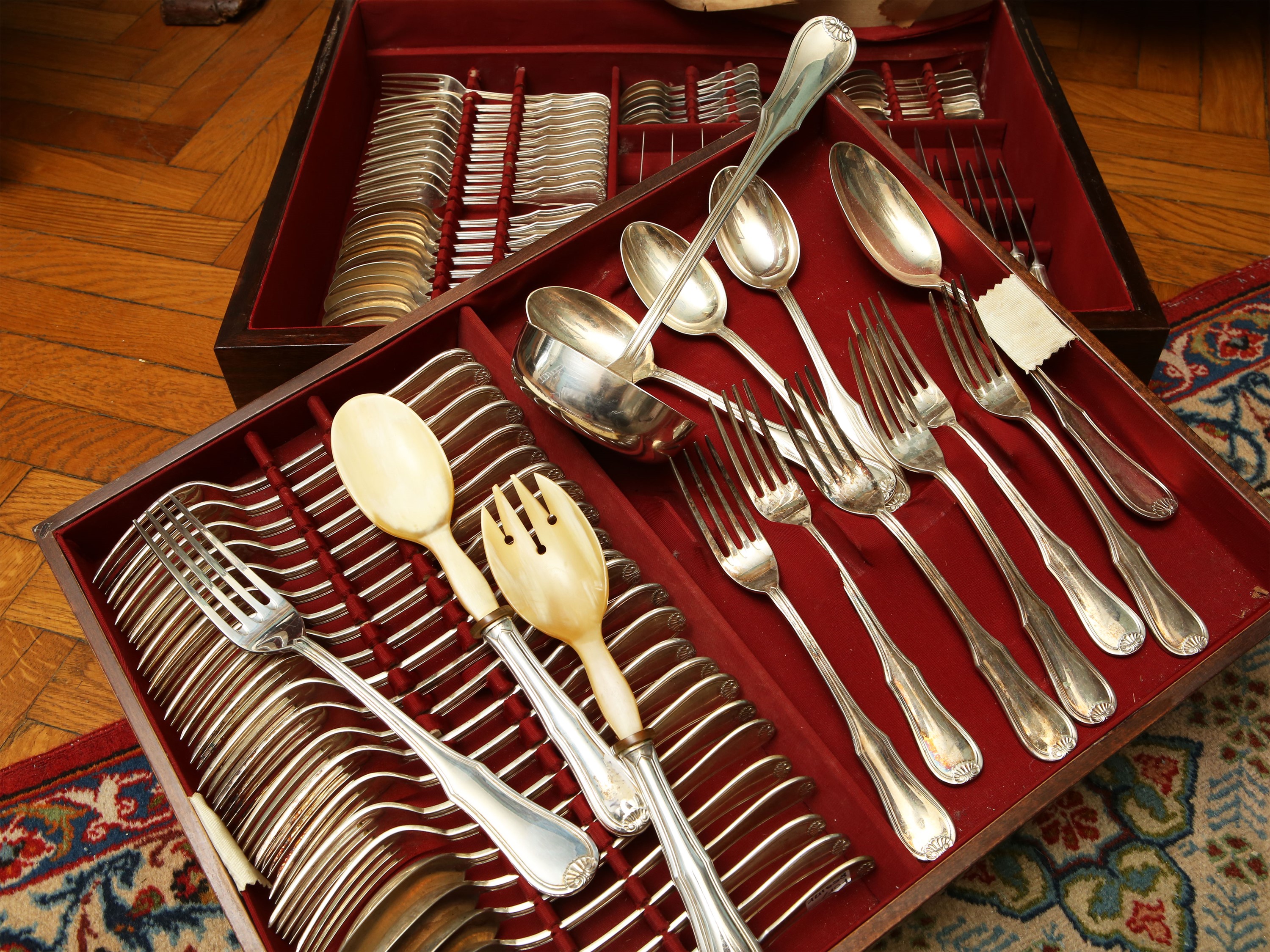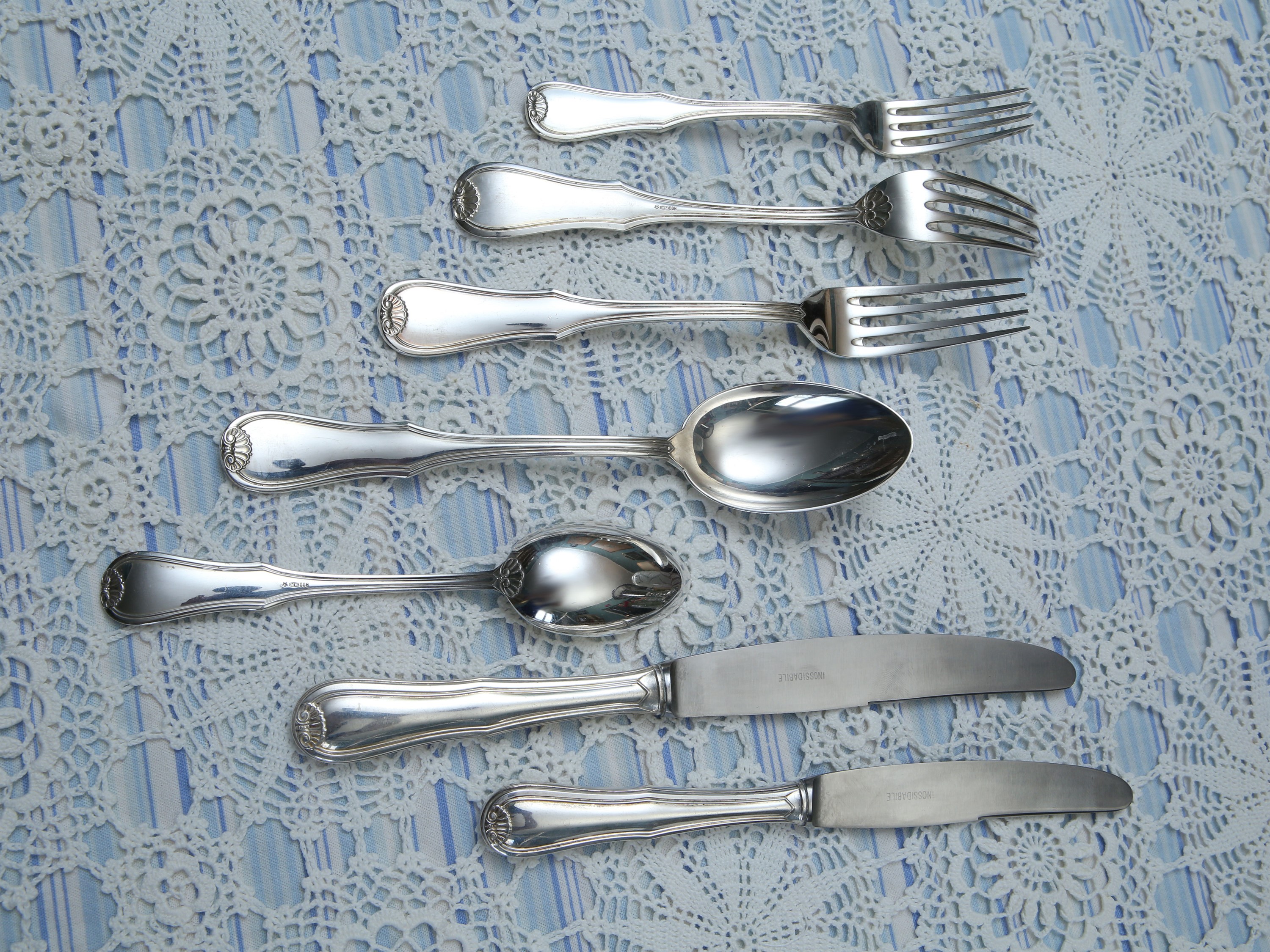 Padova, metà del XX secolo contenuto nel suo cofanetto originale impiallacciato in piuma di mogano, manici cesellati con motivo a conchiglia, composto da 24 forchette, 12 cucchiai, 12 coltelli, 12 forchette e coltelli da frutta, 12 cucchiai da dolce, 12 cucchiaini da caffè, un ramaiolo e 4 posate a servire, alcuni difetti al cofanetto
