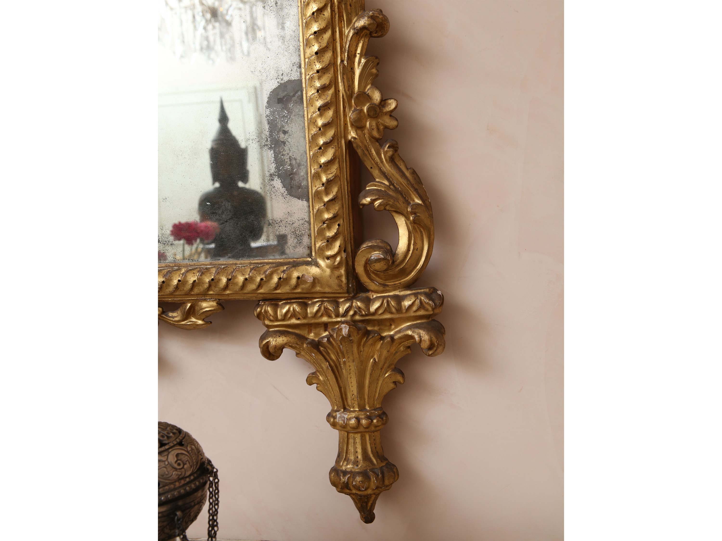 cm 180x84 seconda metà del XVIII secolo alta cimasa realizzata a volute alternate a ghirlande floreali ricadenti ai lati, sormontata da motivo a vaso con trionfo di fiori, cornice interna guillochè, pendaglina centrata da mascherone, su alti piedi a volute vegetali, specchio al mercurio