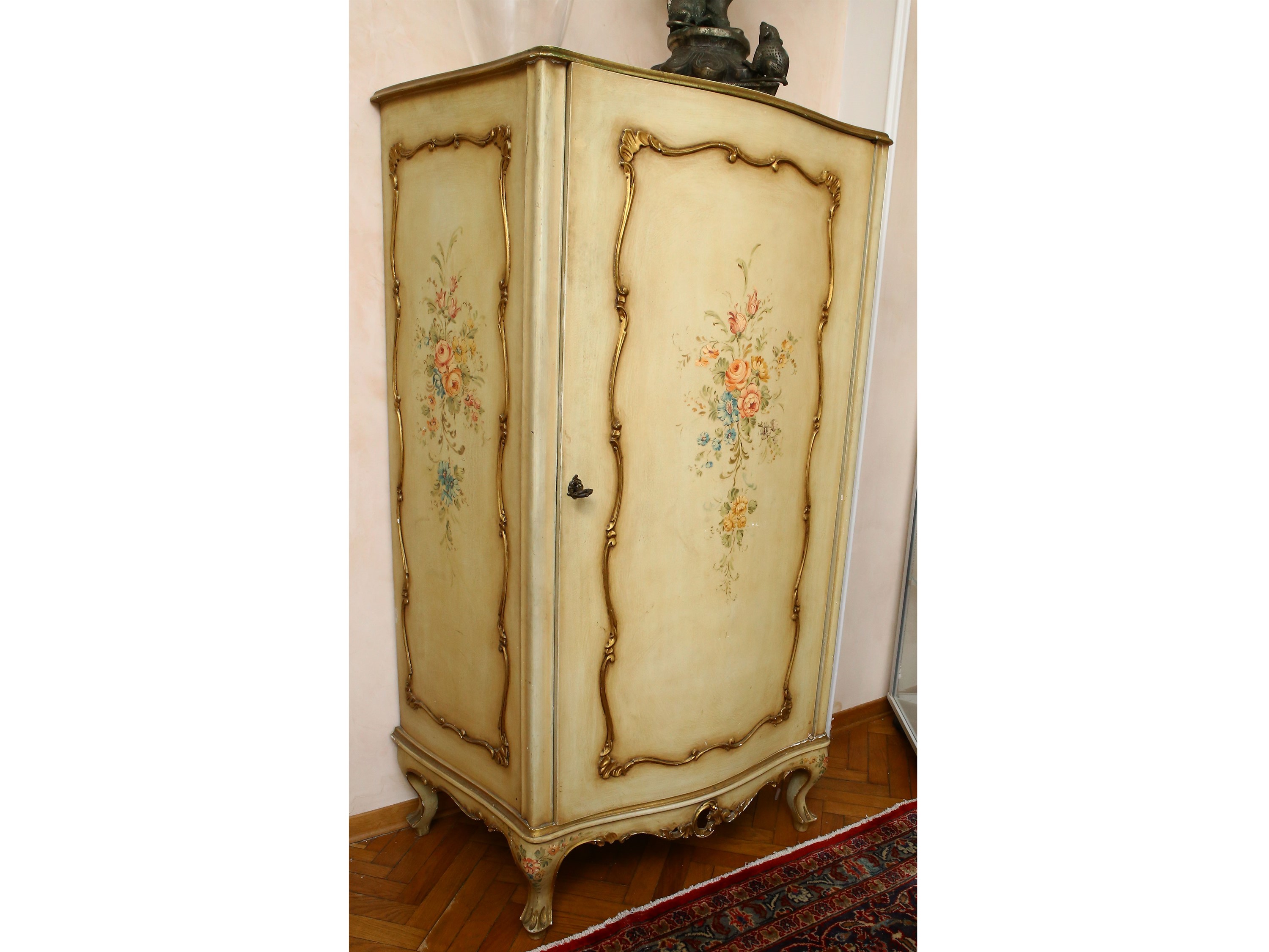 XX secolo realizzato in stile veneziano, uno sportello dipinto a motivi floreali su fondo avorio entro cornice lumeggiata in oro, piedi a ricciolo
