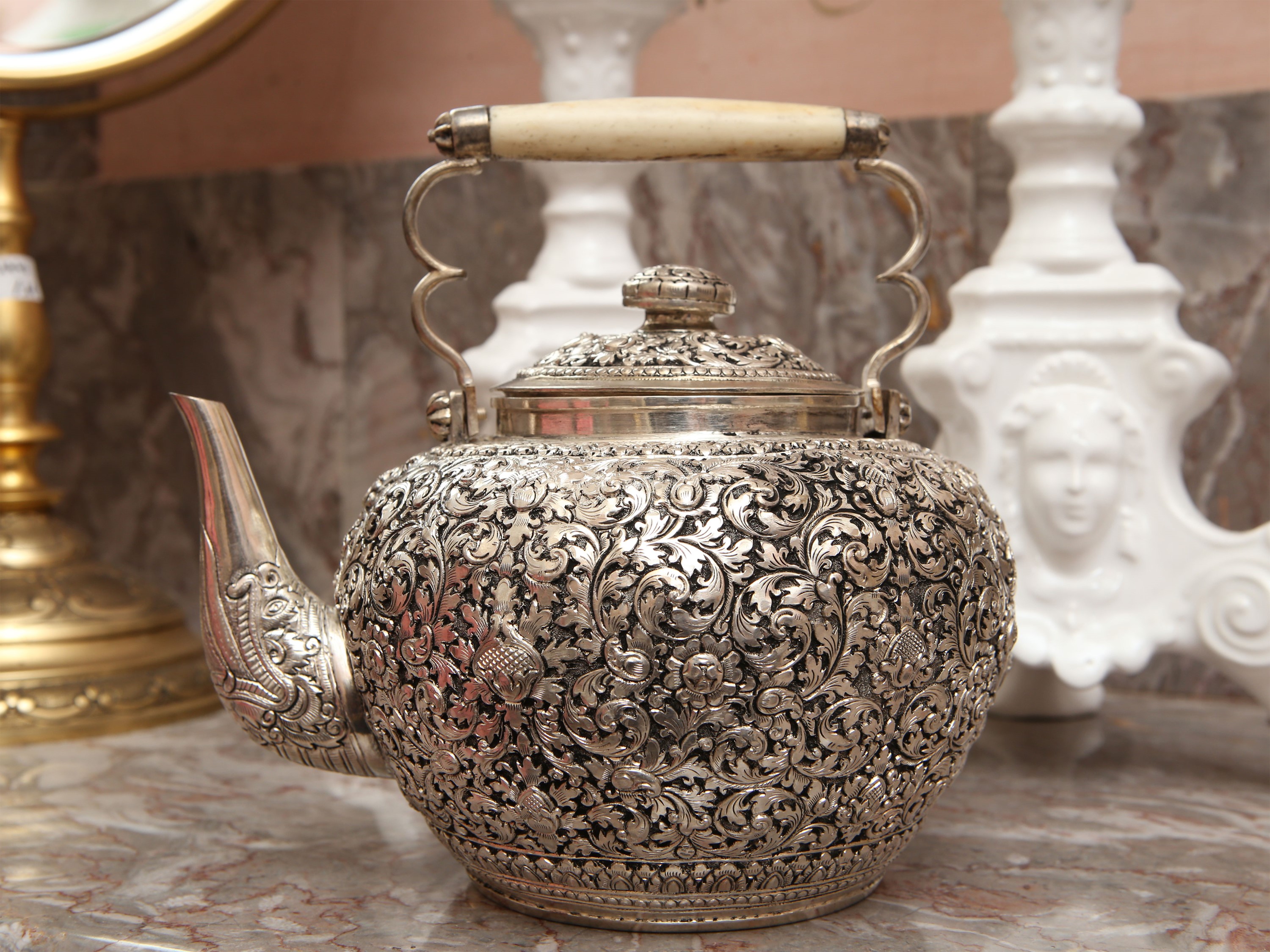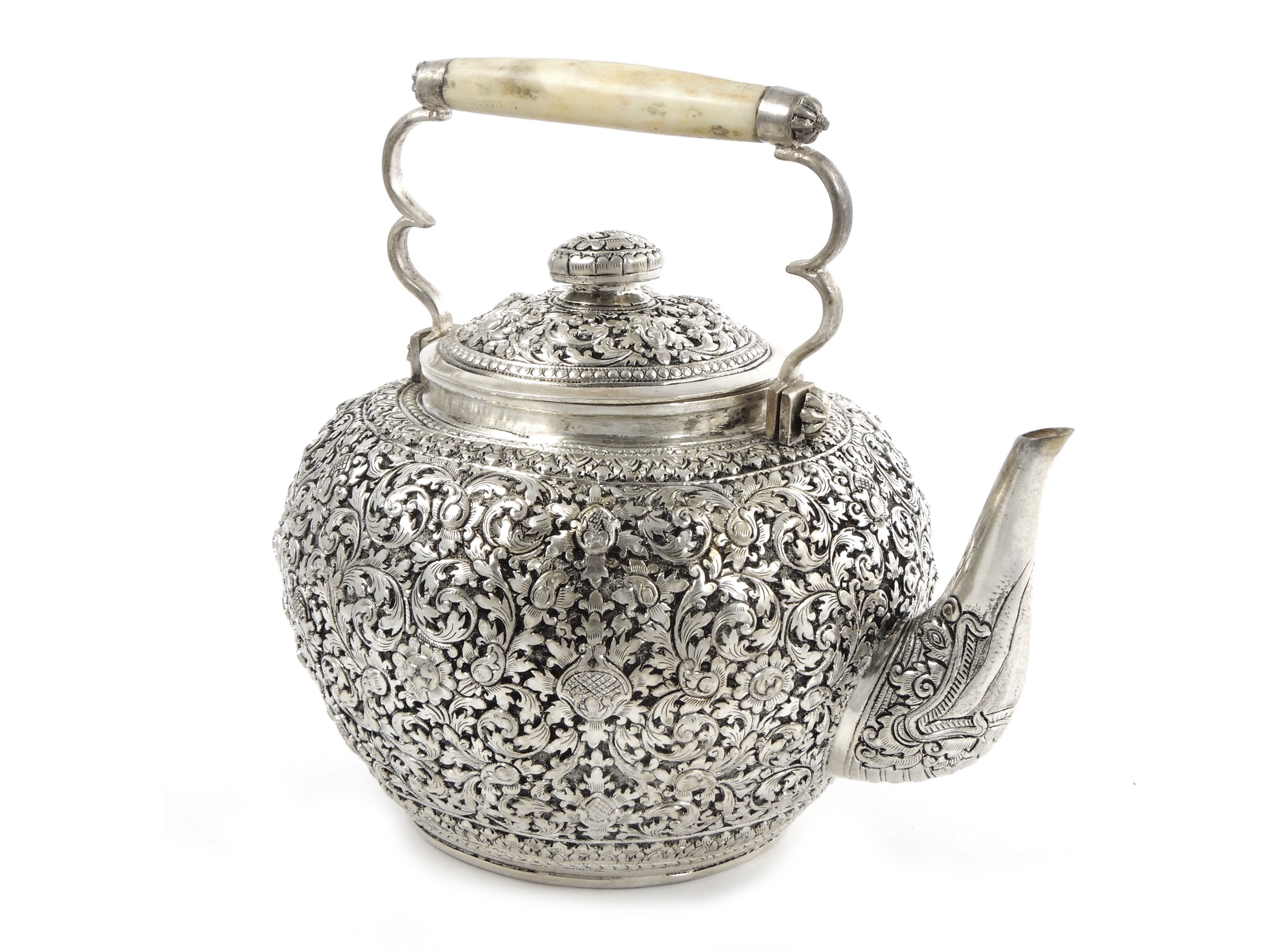 probabilmente India, inizio del XX secolo di forma globulare, interamente cesellata con volute vegetali e motivi floreali, presa sagomata