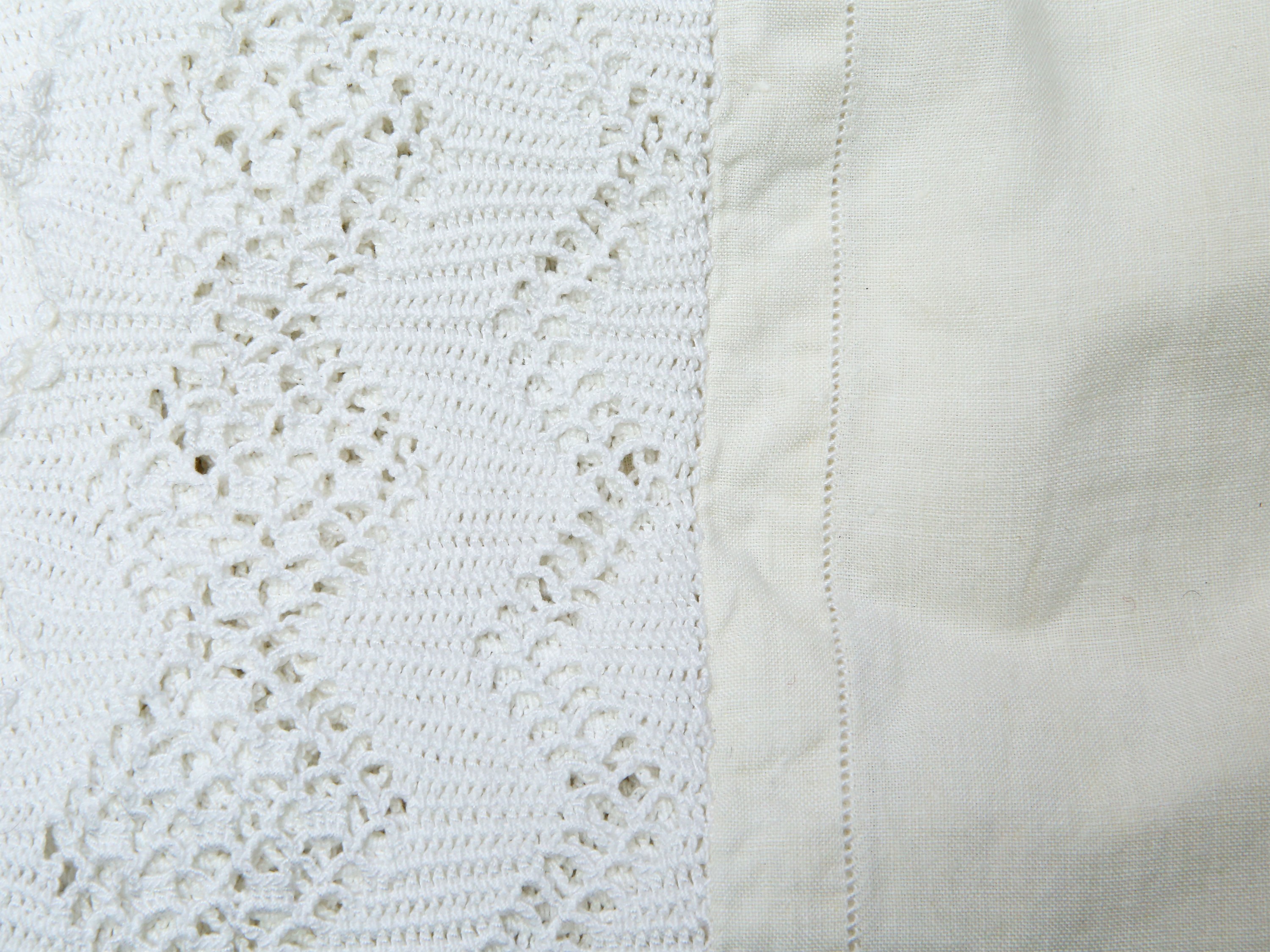 seconda metà del XX secolo inserti a filet in cotone e sfilature a giorno, corredata da 12 tovaglioli, lievi macchie