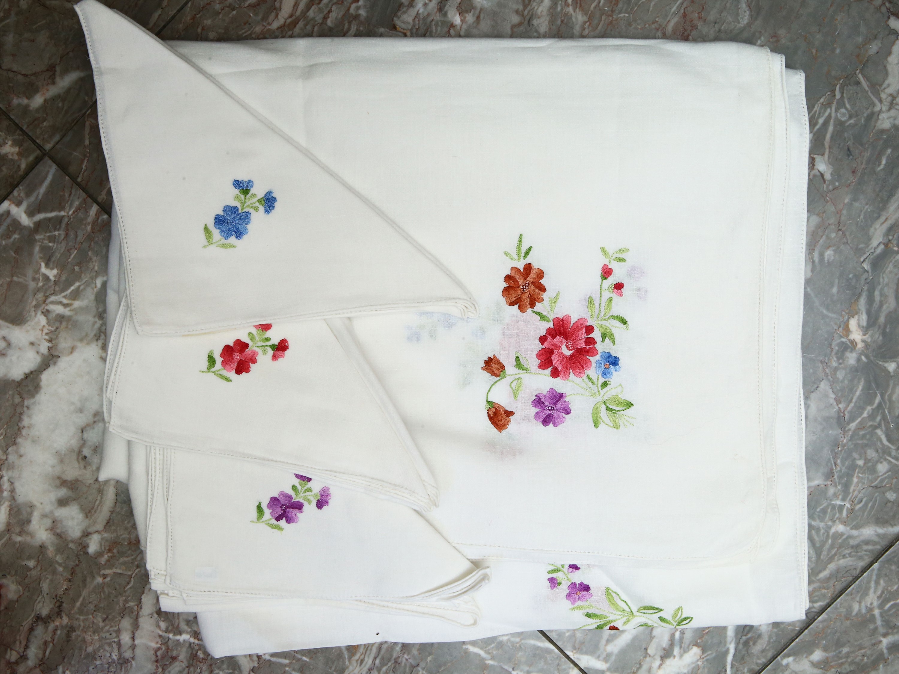 seconda metà del XX secolo ricami floreali multicolor, corredata da 12 tovaglioli, lievi macchie