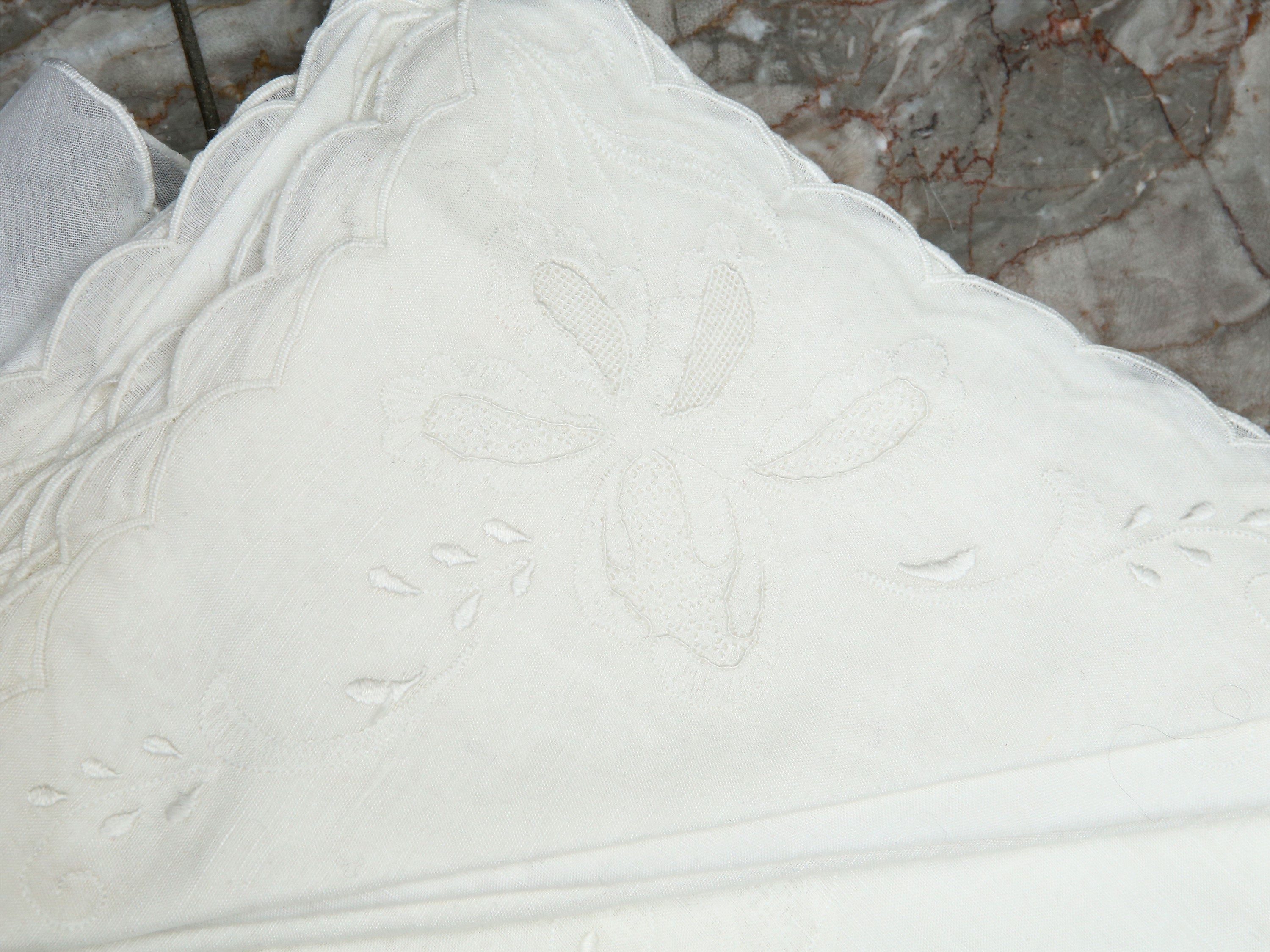 metà del XX secolo ricami floreali bianchi e sfilature a giorno, bordo mosso, corredata da 6 tovaglioli, alcune lievi macchie