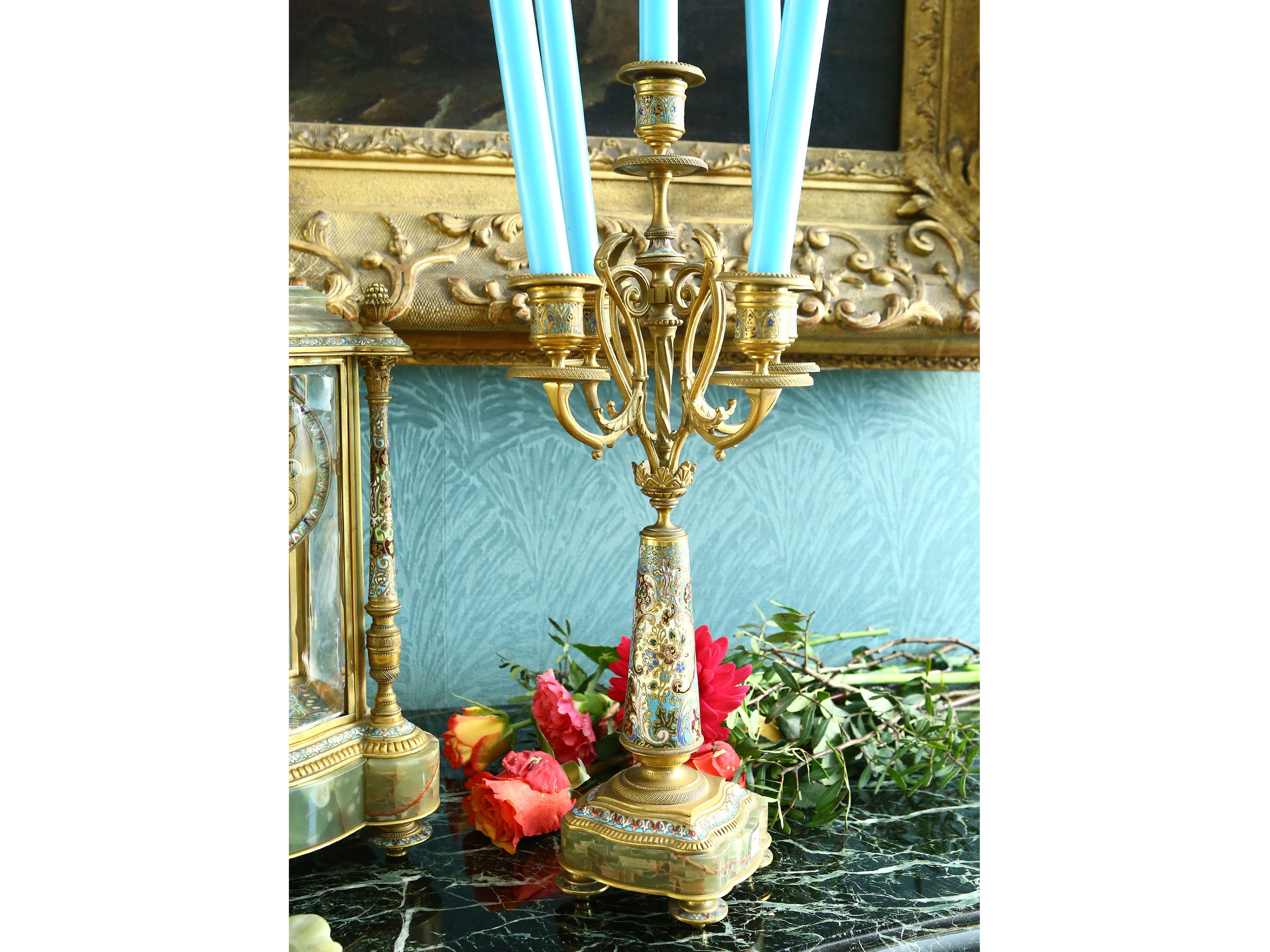 Trittico da camino in metallo dorato, smalti cloisonné e onice, C. Detouche, Par [..]