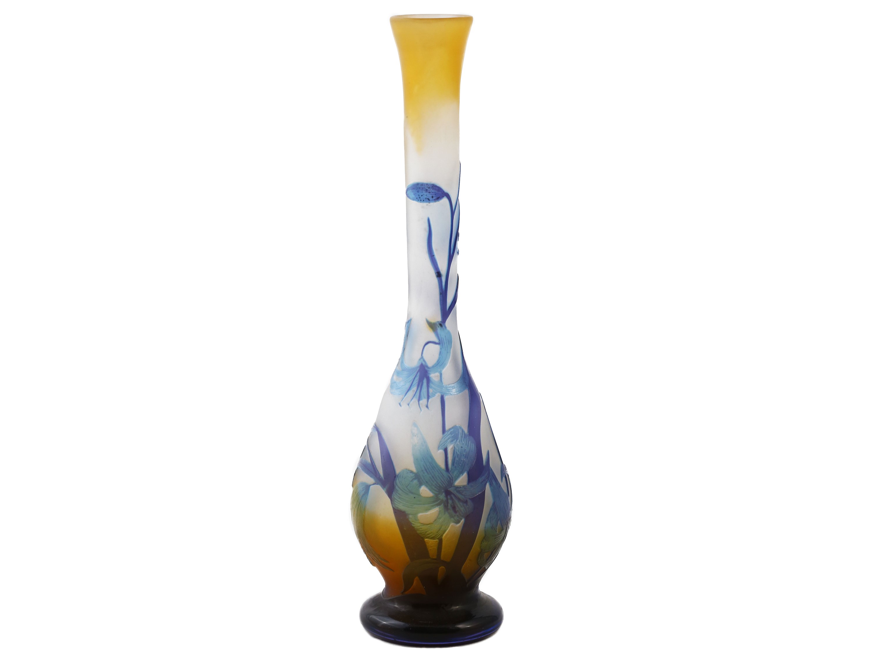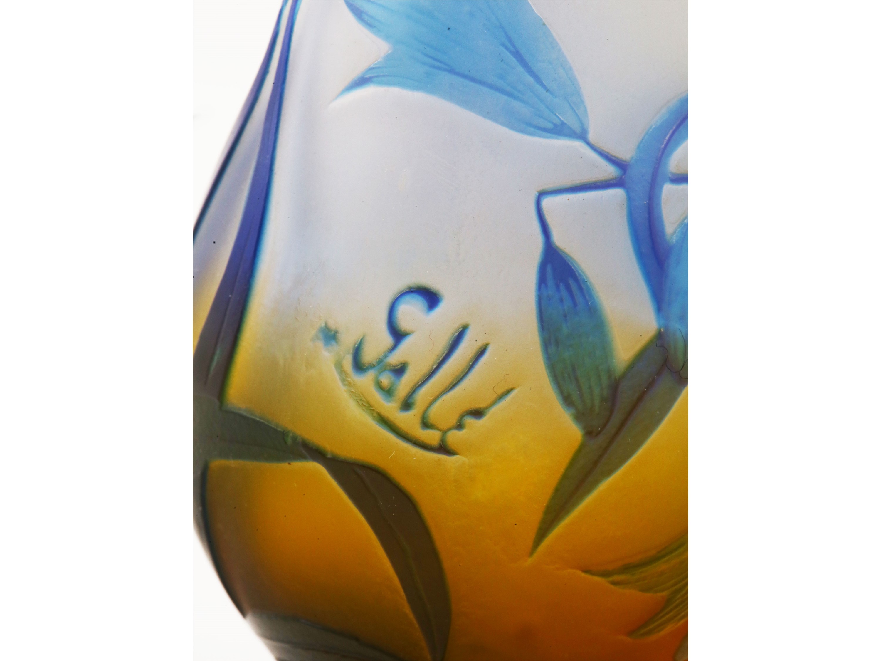 Francia, 1900 ca. con decoro inciso all'acido a cammeo di gigli blu. Firma sul corpo incisa all'acido a cammeo Gallé.