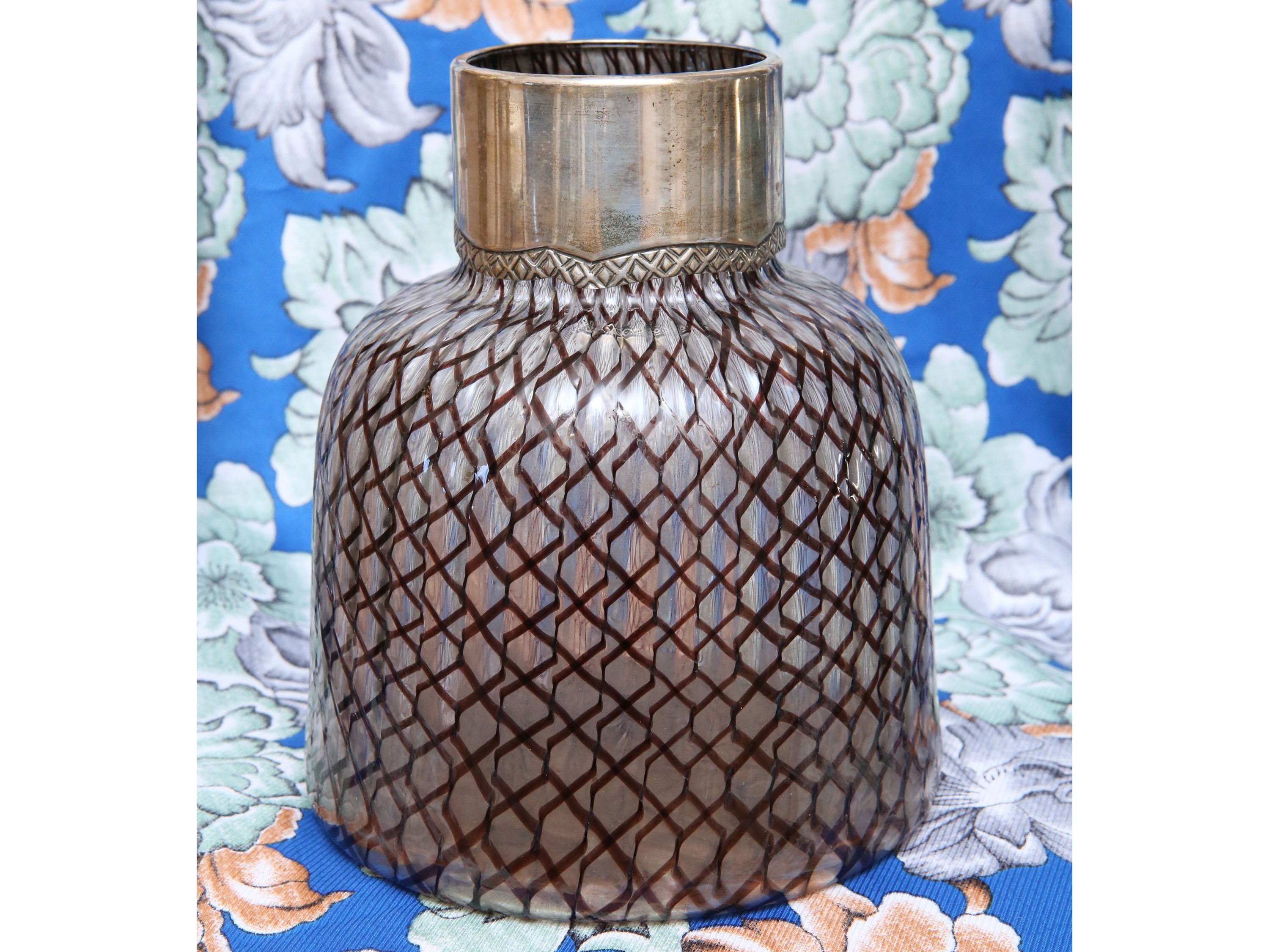 Murano, prima metà del XX secolo con motivo a reticello nei toni del rosso scuro, collo con rivestimento in argento