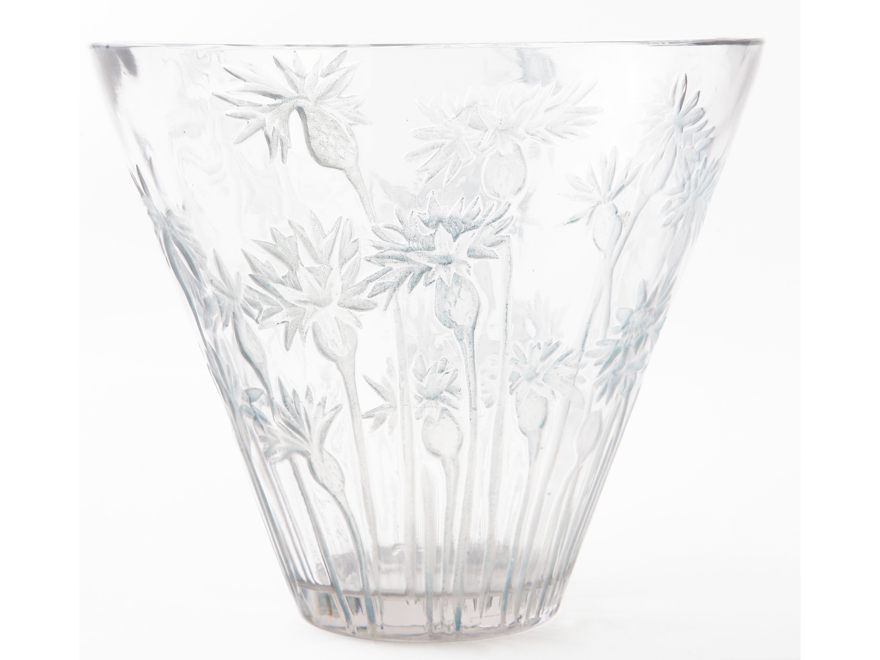 Francia, 1920 circa creato nel 1914 in vetro bianco pressato con decoro di fiori incisi all'acido. (Moule n° 930). Firma incisa sotto la base R. Lalique. Possibile molatura sul bordo.
