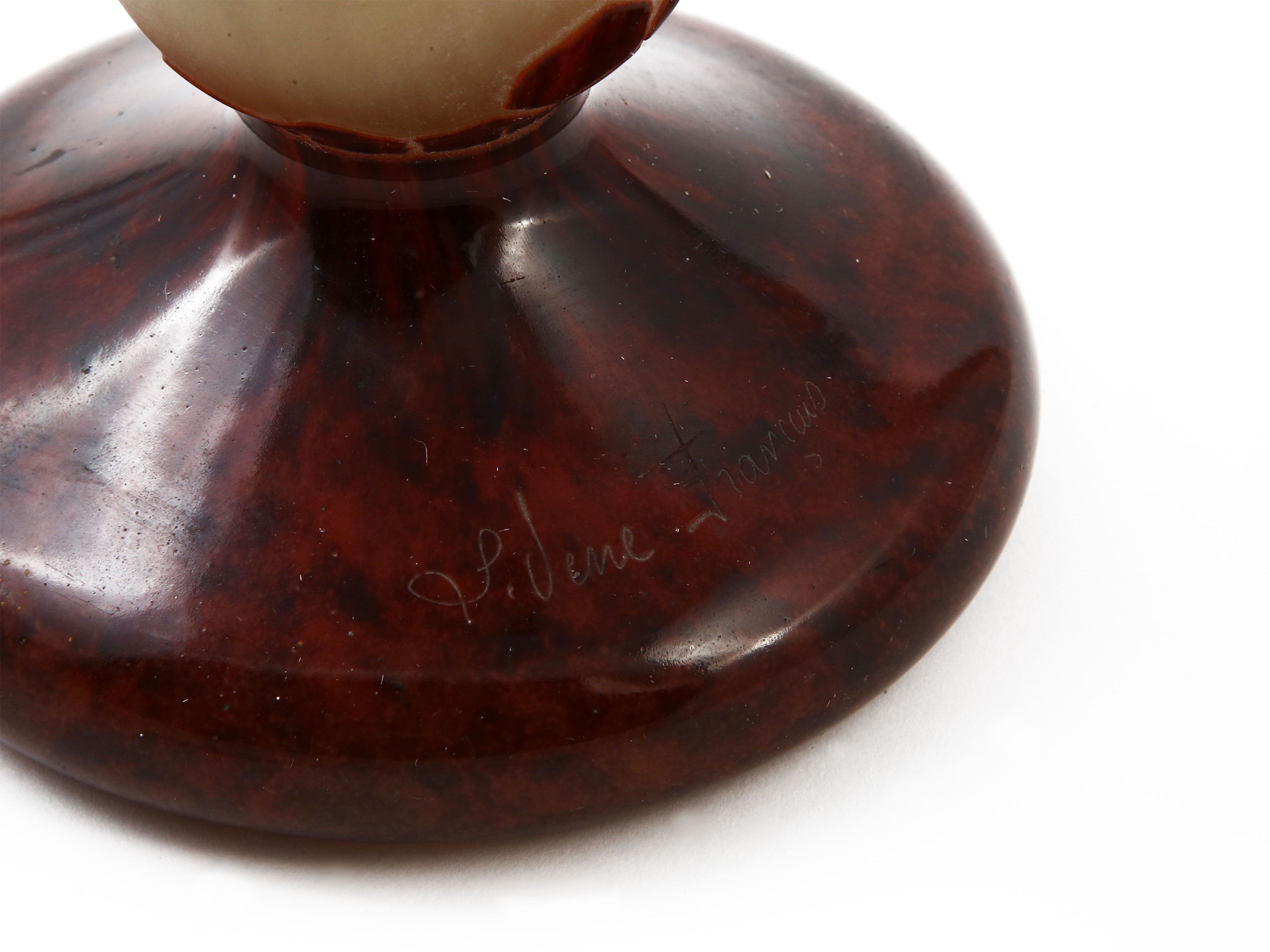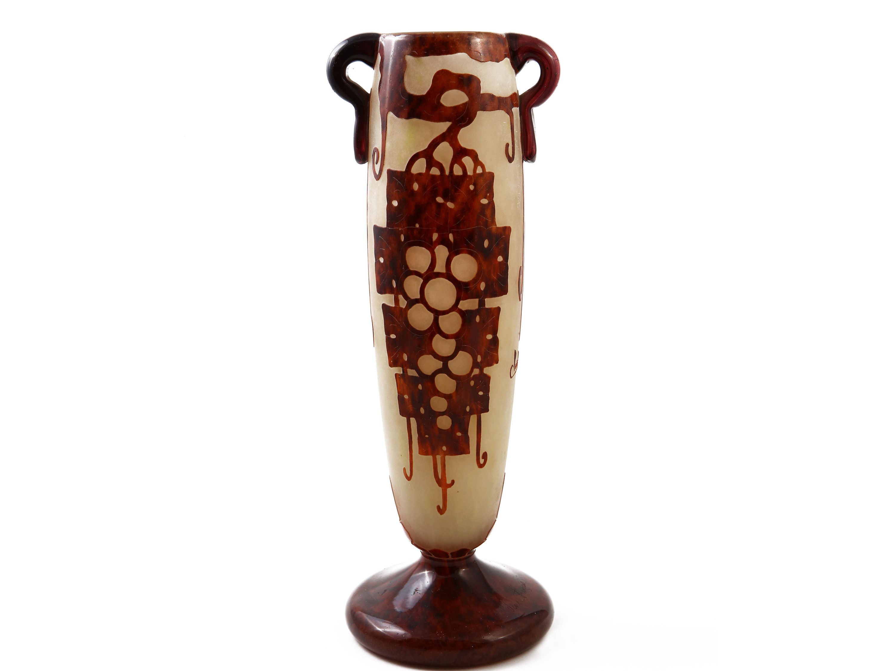 Francia, 1927-1928 con motivo di uva stilizzata sui toni del viola e giallo, manici applicati a caldo. Firmato sul corpo Charder a cameo e Le Verre Français alla base.