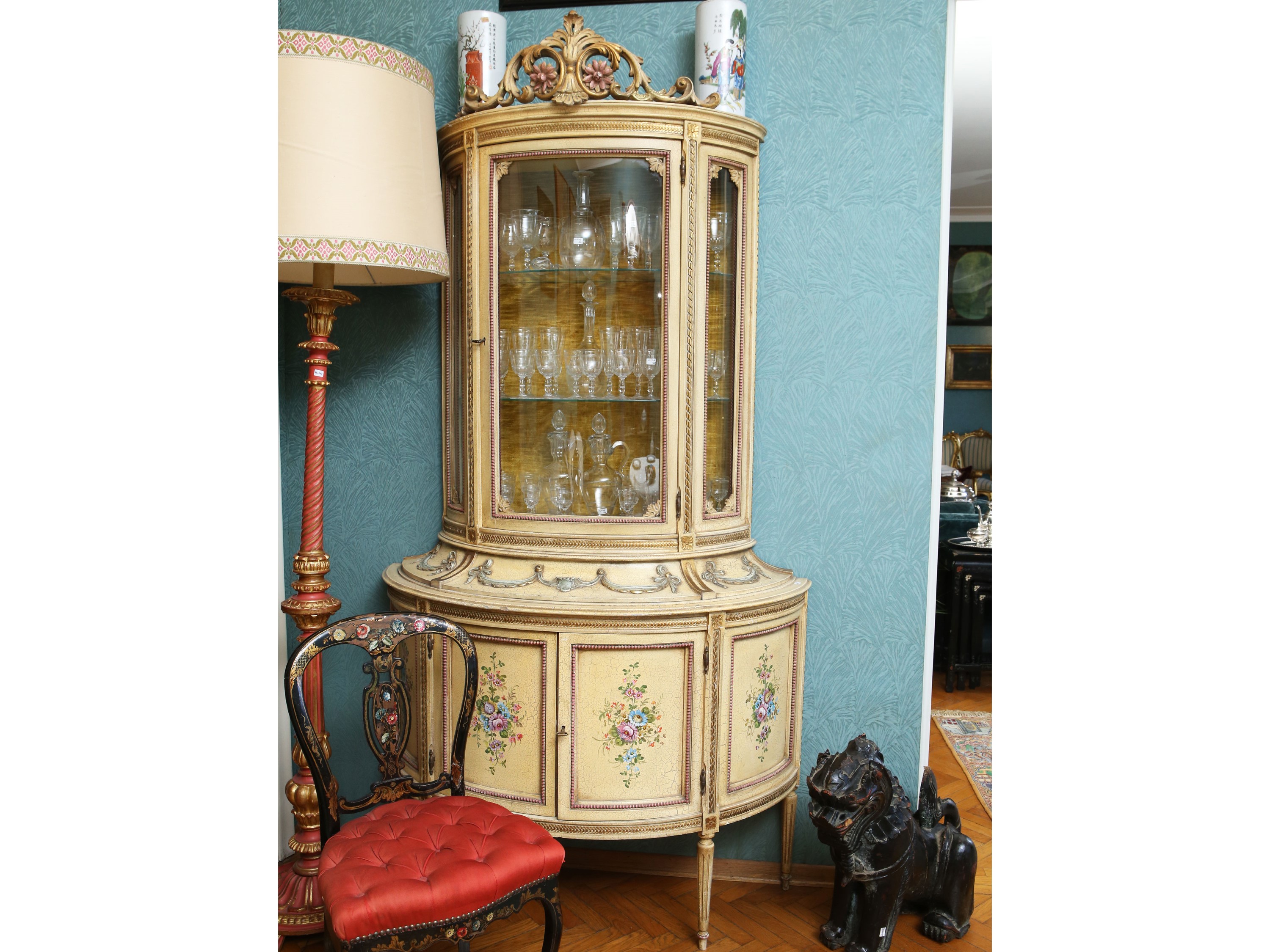 XX secolo fronte a mezzaluna, cimasa intagliata con volute contrapposte, parte superiore a vetro con sportello centrale, interno rivestito in velluto giallo oro con ripiani in cristallo, fascia svasata con cassetto segreto, parte inferiore a doppio sportello centrato da motivi floreali, gambe a faretra scanalata, lievi difetti