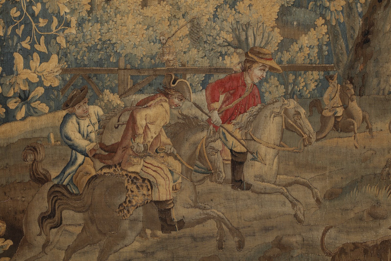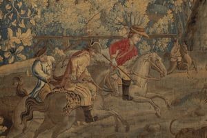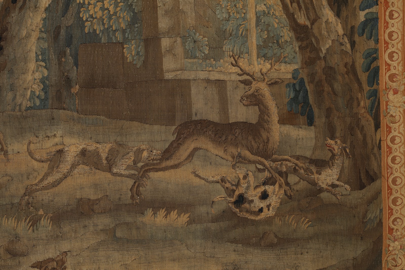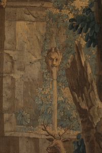 Arazzo raffigurante la caccia al cervo entro bordura decorata a medaglioni