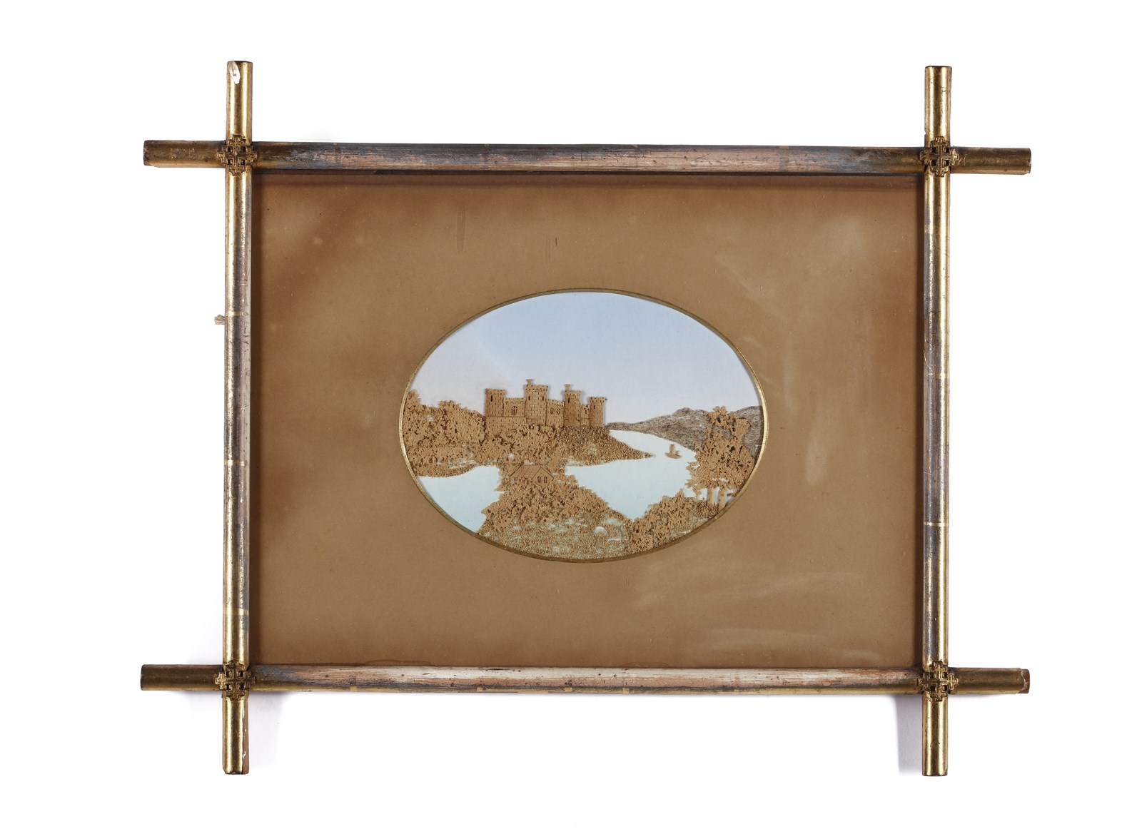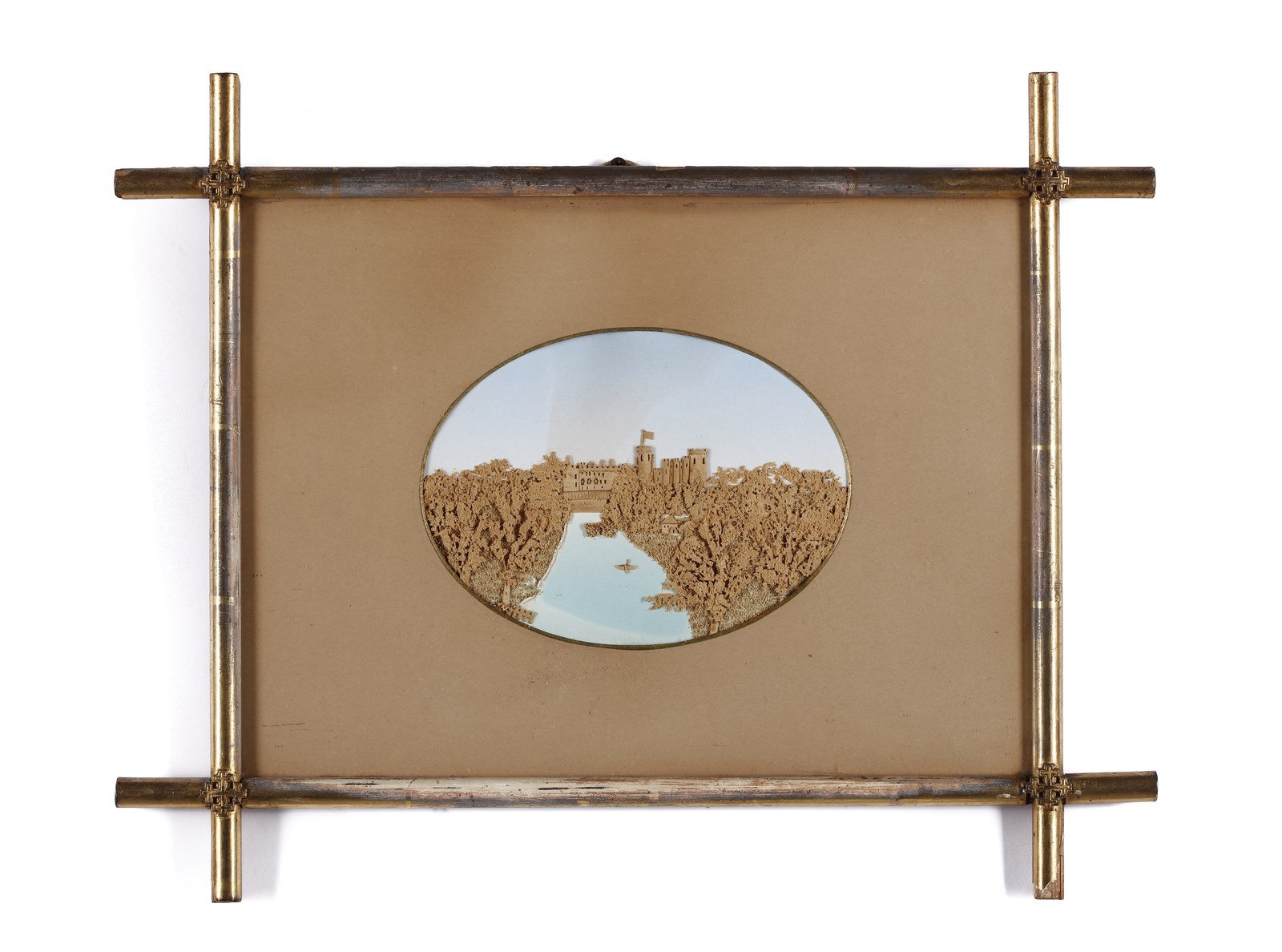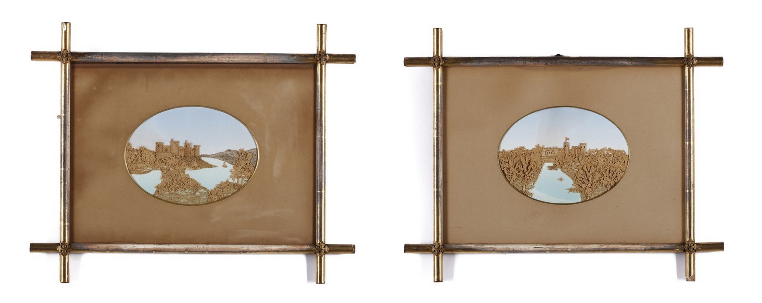 Coppia di fregi in sughero con paesaggi dipinti in policromia