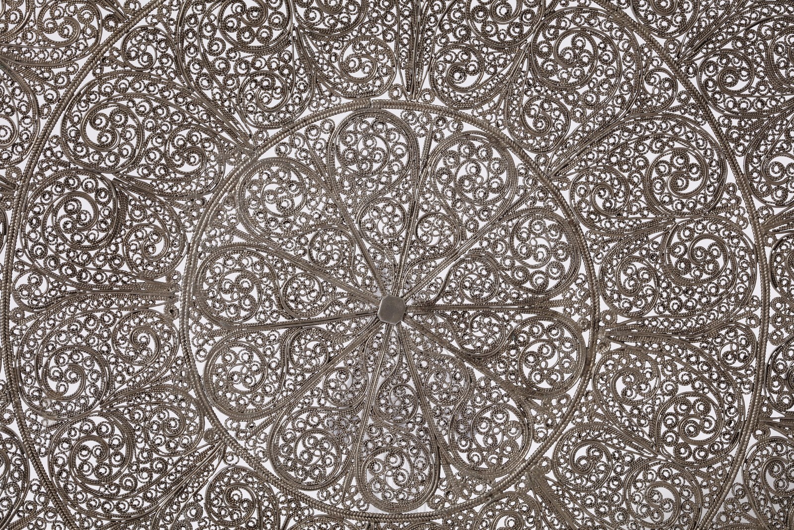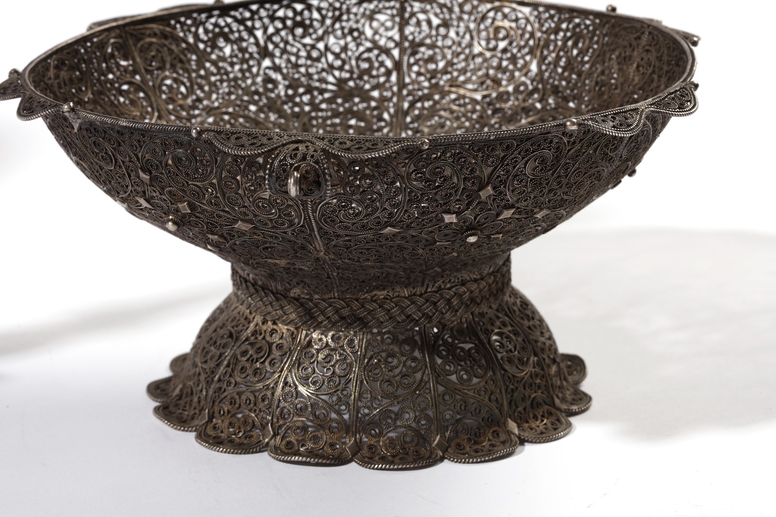 Gruppo di 5 argenti: vassoio, coppia di candelabri, fruttiera ed elemento in arg [..]