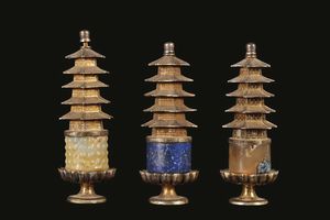 TRE ANELLI, CINA, DINASTIA MING-QING, SEC. XVII-XIX in giada, lapislazzulo e agata montati in argento con forma [..]