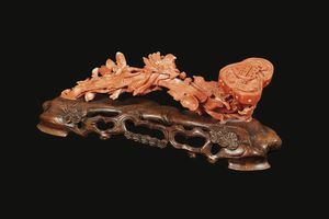 SCULTURA IN CORALLO, CINA, SEC. XX raffigurante scettro su base in legno. Lungh.cm 21,5 g.364,2 con base 清 [..]