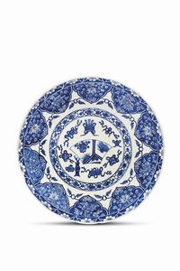 PIATTO, CINA, DINASTIA QING, SEC. XVIII in porcellana bianco blu a forma di fiore decorato con “otto oggetti [..]