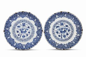 COPPIA DI PIATTI, CINA, DINASTIA QING, SEC. XVIII in porcellana bianco blu a forma di fiore decorata con “otto [..]