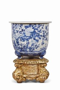 GIARDINIERA, GIAPPONE, SEC. XIX-XX in porcellana bianco-blu con base a tre piedi, decorata a tutto tondo con rami, [..]