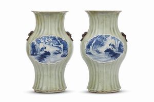 COPPIA DI VASI, CINA, DINASTIA QING, SEC. XIX in porcellana verde celadon con riserve bianco-blu e prese in grès [..]