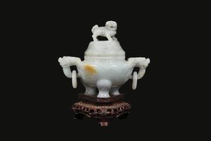 INCENSIERE TRIPODE, CINA TARDA DINASTIA QING, SEC. XIX-XX in giadeite color verde pallido e russet, due orecchie [..]