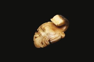 INTAGLIO, CINA, FINE DINASTIA MING, SEC. XVII in giada bianca con russet raffigurante cane accovacciato. lungh.cm [..]