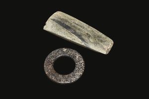 GRUPPO DI GIADE, CINA, PERIODO NEOLITICO composto da una lama di forma trapezoidale con marezzature scure e disco [..]