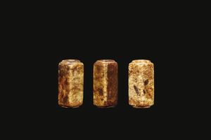 TRE ELEMENTI, CINA, PERIODO NEOLITICO di forma Cong con foro centrale per collana, color scuro con marezzature. [..]
