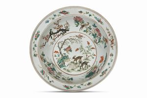 BACILE, CINA, DINASTIA QING SEC. XIX in porcellana policroma decorato con cerbiatti e volatili. Diam.cm 35,5 [..]
