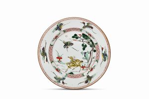 PIATTO, CINA, DINASTIA QING SEC. XVIII PERIODO KANGXI decorato con colori della famiglia verde con sei gru sul [..]