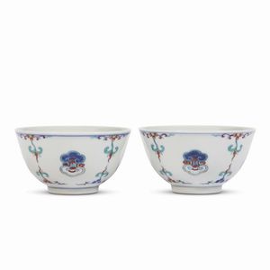 COPPIA DI CIOTOLE, CINA, DINASTIA QING in porcellana policroma “Doucai” decorata con teste di ruyi, [..]