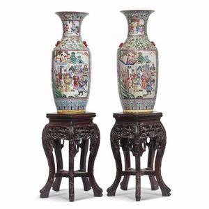 COPPIA DI VASI, CINA, DINASTIA QING, SEC. XIX In porcellana Canton decorata con personaggi entro riserve. Alt.cm [..]