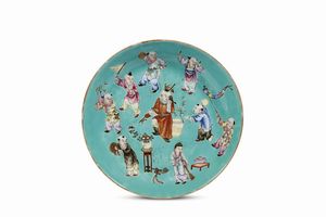 PIATTO, CINA, PERIODO REPUBBLICA, 1912-1949 in porcellana con sfondo turchese dipinto con bambini che giocano, [..]