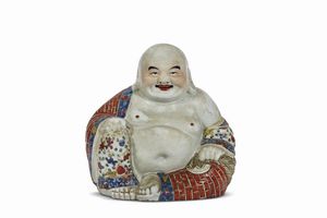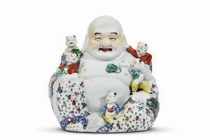BUDDHA, CINA, PERIODO REPUBBLICA, 1912-1949 in porcellana policroma in posizione seduta con cinque bambini. Alt.cm [..]