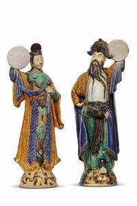 COPPIA DI SCULTURE, CINA, DINASTIA QING, SEC. XIX in ceramica Shiwan raffigurante personaggi di opera teatrale. [..]