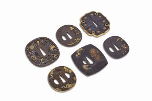 TSUBA, GIAPPONE, SEC.XIX in ferro cesellato e inciso con dettagli in rame e dorato di varie forme e decori. Tsuba, [..]