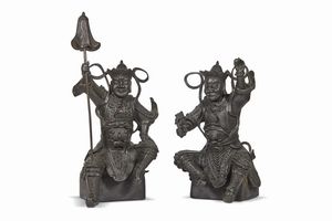 COPPIA DI GUERRIERI, CINA, DINASTIA QING, SEC. XIX in bronzo brunito seduta su una base squadrata, con in mano [..]