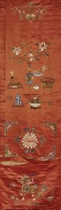 COPPIA DI RICAMI, CINA, DINASTIA QING, SEC. XIX in seta raffigurante oggetti fiori e Qilin. Dim.cm 185 x 45 清 [..]