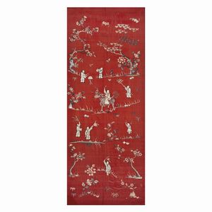 COPPIA DI TESSUTI, CINA TARDA DINASTIA QING, SEC. XIX-XX con sfondo rosso personaggi e fiori finemente ricamati. [..]