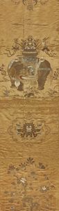RICAMO, CINA, DINASTIA QING, SEC. XIX in seta raffigurante elefante e vaso Tai Ping You Xiang. Alt.cm 160 x 45 [..]