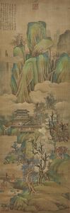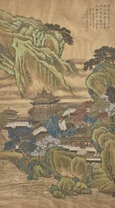 DISEGNO, CINA, TARDA DINASTIA QING SEC. XIX-XX su carta raffigurante paesaggio con palazzi in verticale, scritta [..]