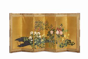 PICCOLO PARAVENTO ORO, GIAPPONE, SEC. XIX composto da sei ante dorate e dipinto con fiori rami e foglie. Dim.cm [..]