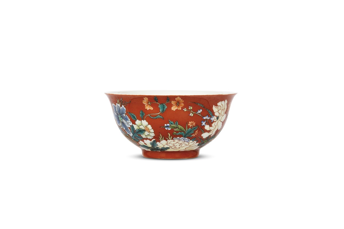 中国 二十世纪 珐琅彩红地花卉纹碗