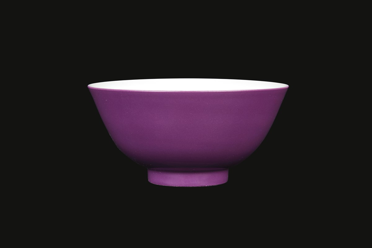 in porcellana monocroma color viola, marchio a sei caratteri Yongzheng in blu sotto smalto.
