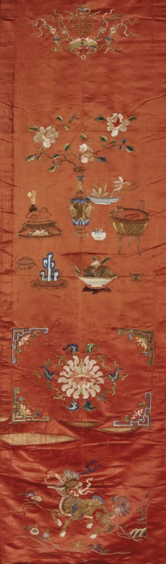 清 十九世纪 砖红地博古麒麟刺绣一对