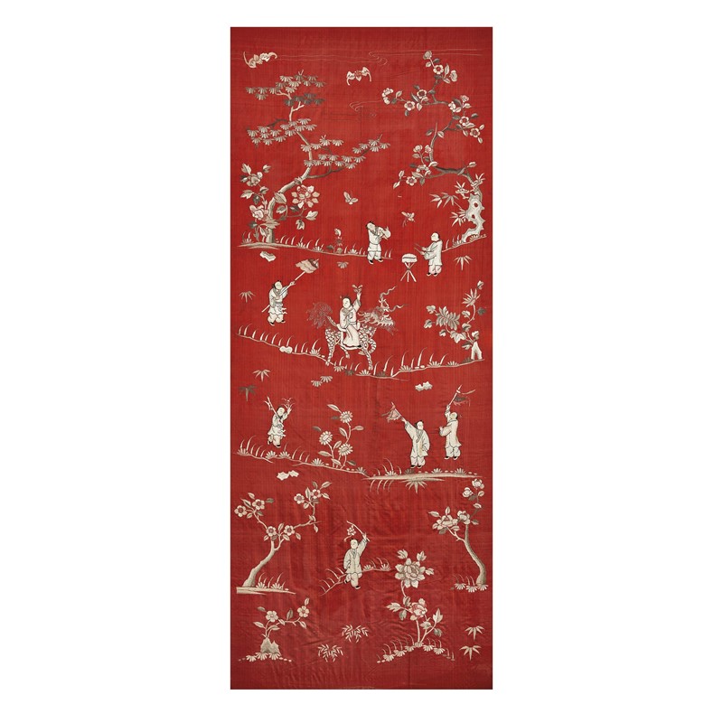 COPPIA DI TESSUTI, CINA TARDA DINASTIA QING, SEC. XIX-XX con sfondo rosso personaggi e fiori finemente ricamati. Dime.cm 163,5 x 64 晚清 十九至二十世纪 红地人物纹绣品一对
