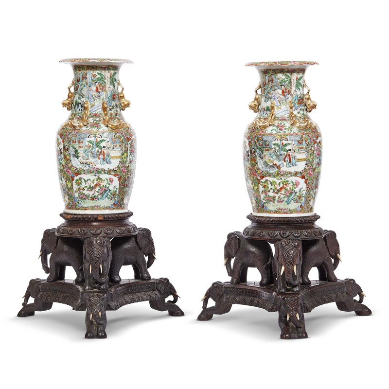 in porcellana Canton con fiori e personaggi entro riserve, basi in legno con piedi a forma di elefante.